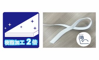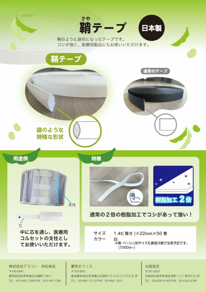 特長 鞘テープ 袋のような特殊な形状になっており、中に芯を通すことで支柱として使用できます。 通常の2倍の樹脂加工でコシがあって強い! 通常のテープ 使用例 中に芯を通し、医療用のコルセットの支柱としてお使いいただけます。 規格 サイズ 1.4t(厚さ)×22mm×50巻 カラー 白 ※黒・ベージュ別サイズもご要望次第で生産予定です。(700m~) 資料